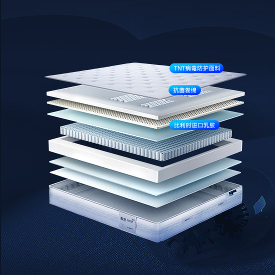 | 主 材 | 德国AGRO五区独立筒+立柱式太空树脂球+德系 Muller 3D空气纤维+比利时进口乳胶+TNT抗病毒 面料+抗菌卷绵 |